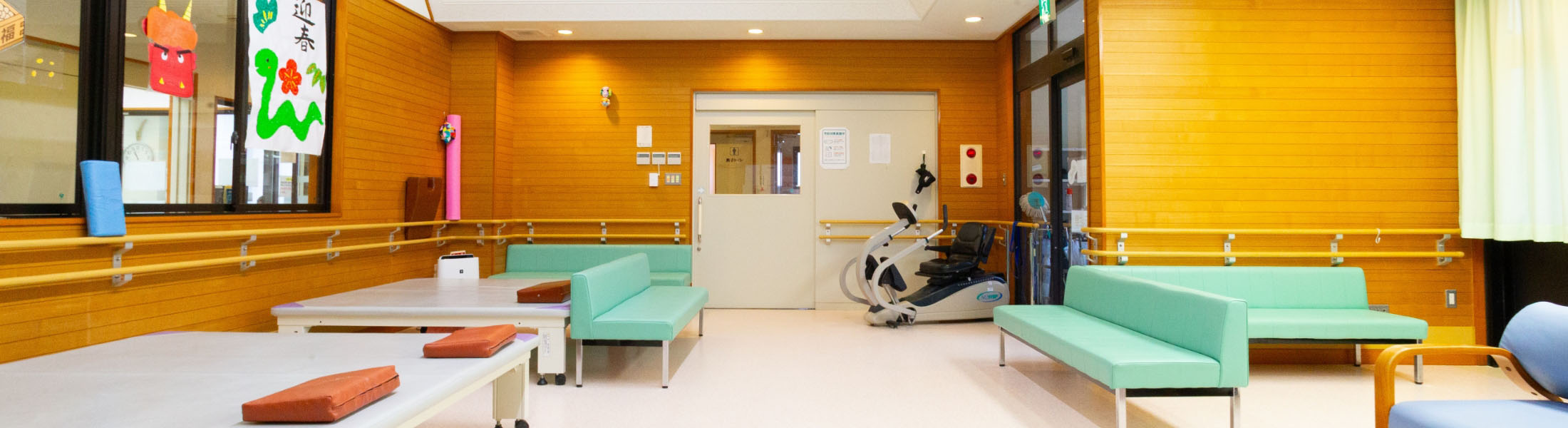 日の光が差し込み開放感を感じるデイケア室で理学療法士によるリハビリが受診いただけます。